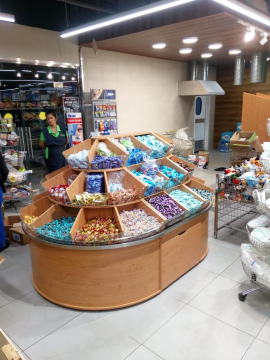 Стеллажи для конфет изготовлены из ЛДСП и стекла. Применяются для продажи конфет, сухофруктов, орехов и других сыпучих товаров.