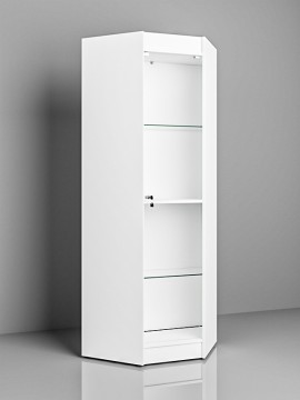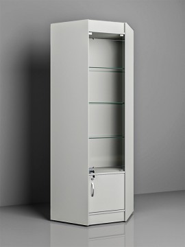 - Углового формата витрины с зонами хранения, стеклянными полками и декоративными элементами из МДФ.