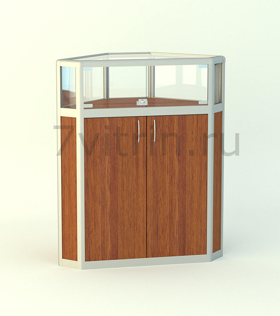 Горизонтальная угловая (внутренний угол) витрина из алюминиевого профиля. Размером 900х700х700мм. Каркас анодированного алюминиевого профиля, в цвете матовое серебро. Нижняя часть витрины 700мм., выставочная часть 200мм. Открывание стеклянных дверей возможно в 2-х исполнениях, раздвижные и распашные. Возможна комплектация дополнительными полками замками, регулировочными опорами. Цвет облицовки на выбор из каталога.