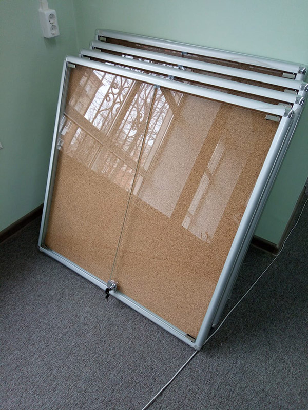 Навесной стенд с распашными стеклянными створками. Задняя стенка из пробкового материала толщ. не менее 6мм.Размещение информации, с помощью кнопок, или наклейкаРазмер секции стенда: 1000х50х1000мм.Стеклянные распашные двери с замком в комплекте. - 700901008051 - 700901008051