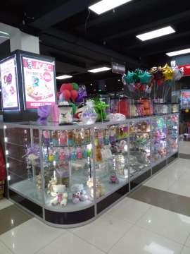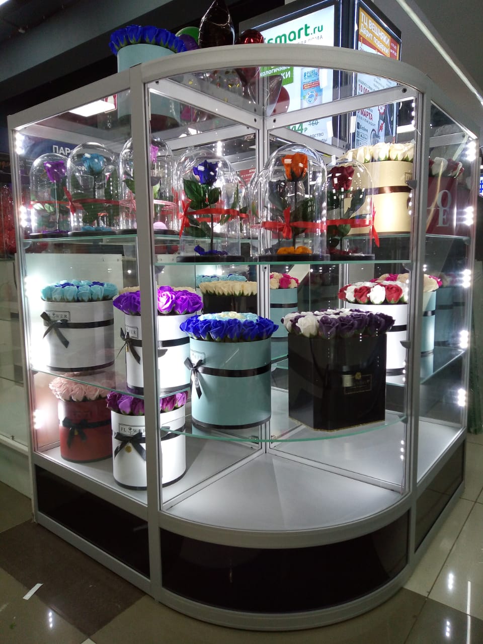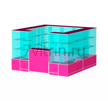 Островной павильон в торговый центр. Размер 1300х500х4200мм. Состоит из каркаса алюминиевого профиля, стекла и ЛДСП 16мм. Крайние секции с радиусным закруглением. Внутренние стеклянные двери на раздвижной системе, регулируемые полки. Вид островной витрины П-образный. Дополнительно возможна установка подсветки, дополнение полками.