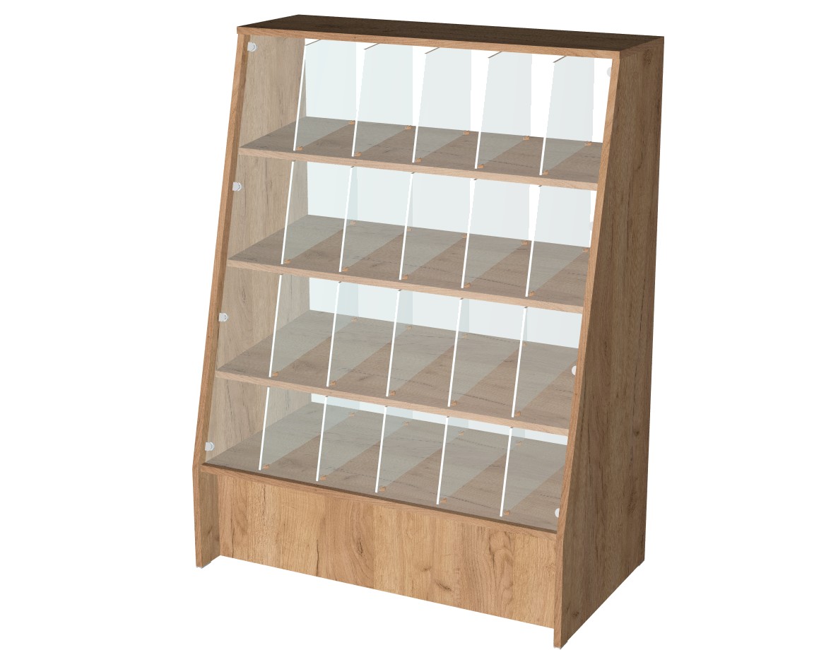 Прилавок кондитерский 24 ячейки. Размер ВхГхШ 1200х500х900ммЦвет на выбор.Прилавок изготовлен из ЛДСП, стекла. Со стороны продавца, прилавок открыт, и имеет ограничительный бортик на полки. Данные прилавки серии "Кондитерский" могут быть собраны в единую композицию, мини павильон, островной прилавок.