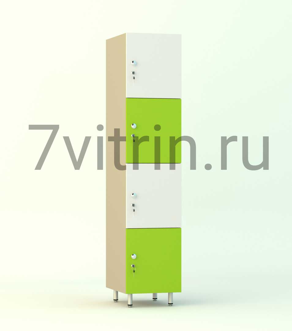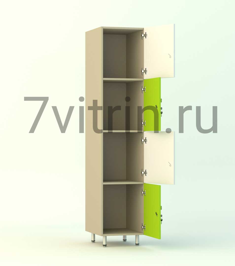 -Чиповый замок скрытого монтажа, механизм спрятан за фасадом.Открытие происходит при помощи карты. -Чиповый замок с толкателем в корпусе. Он открывается с помощью непромокаемых браслетов. -Кодовый замок с сенсорными кнопками.Благодаря наличию 4-х секций, данный шкаф позволяет экономить площадь помещения.