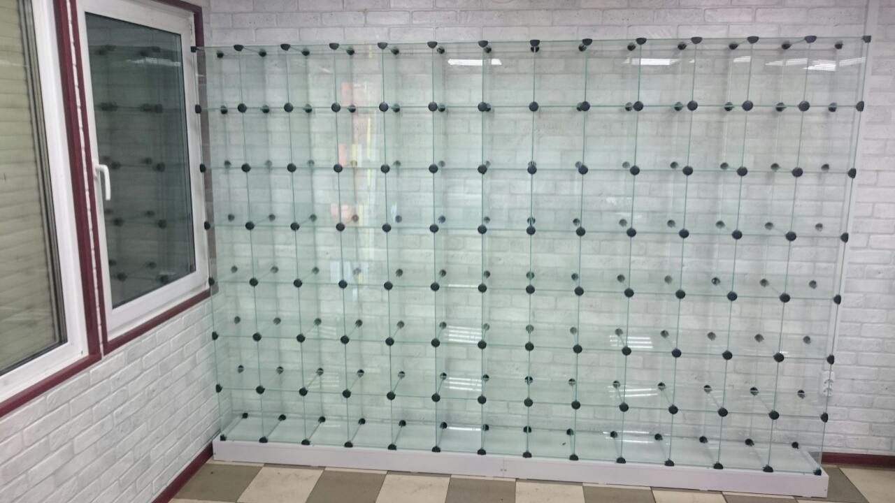 Витрина из стеклянных кубов универсальная. Размер ВхГхД 1444х280ммх1060мм Ячейки 250ммх250ммх250, 4 ячеек в высоту 4 ячейки в ширину. Общее кол-во 16 ячеек. Тумба 400мм. Возможна установка передних ограничителей.