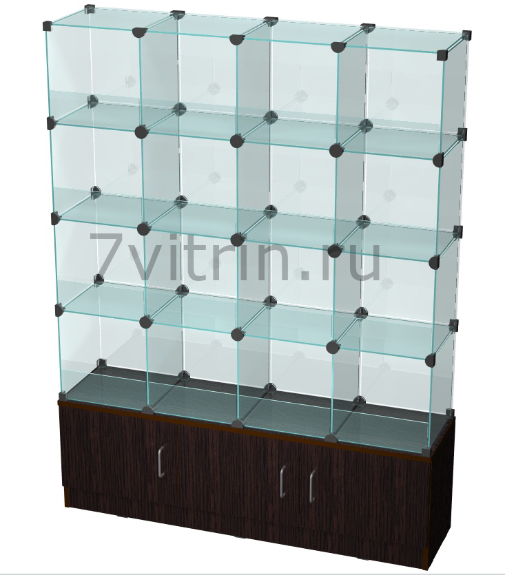 Витрина из стеклянных кубов универсальная. Размер ВхГхД 1744х330ммх1260мм Ячейки 300ммх300ммх300, 4 ячеек в высоту 4 ячейки в ширину. Общее кол-во 16 ячеек. Тумба 500мм. Возможна установка передних ограничителей - СКТ300 - СКТ300