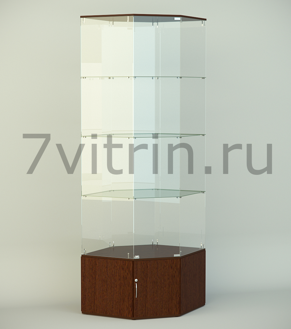 Стеклянная угловая витрина серии СТ8 2000*700*700мм. Шестигранная. Изготовлена из полированного витринного стекла марки М1, Задняя стенка -стекло 5мм. ЛДСП 16мм. производства Кроношпан. Фурнитура -хром. Тумба высотой 400мм. Витрина имеет 3 стеклянные полки, распашные двери с замком. Цвет ЛДСП оговаривается в момент приема заказа. На некоторые декоры ЛДСП возможна доплата. Витрина, применяется, как угловой элемент в композиции прямых витрин. Также, как самостоятельная угловая витрина. Может использоваться как островная витрина для центра зала. Срок изготовления 3-5 раб. дней.