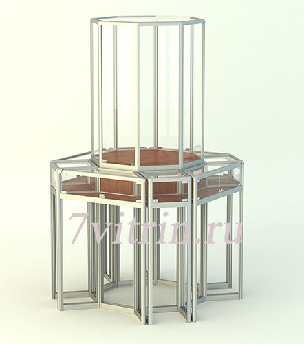 Витрина для музея серии ЛОТОС-Б. Восьмиугольная витрина, изготовлена из каркаса алюминиевого профиля, стекло, ЛДСП. Витрина состоит из 8-ми угловых модулей высотой 900мм., которые расположены вокруг девятого модуля высотой 2000мм. Габаритный размер конструкции 2000мм в высоту и глубину 1500мм. Центральный, высокий модуль имеет глубину -800мм, угловые модули -350мм. Витрина имеет 2 стеклянные полки в девятом модуле. Двери с замком в каждом модуле. Витрина изготавливается под заказ, от 7-12 раб. дней.