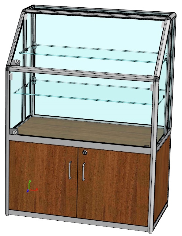 Витрина для музея с накопителем спереди серии "Рубин" 1200*500*1000мм. 2 стеклянные полки+ тумба накопитель высотой 500мм. Двери распашные, с замком. Дополнительно можно изменить цвет, заменить распашной механизм дверей на раздвижной, обтянуть полик и заднюю стенку тканью. - 700901007570 - 700901007570