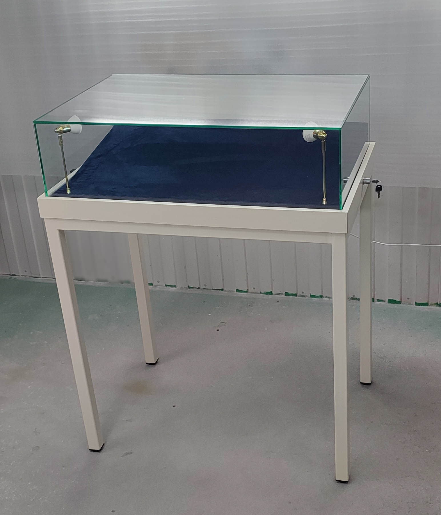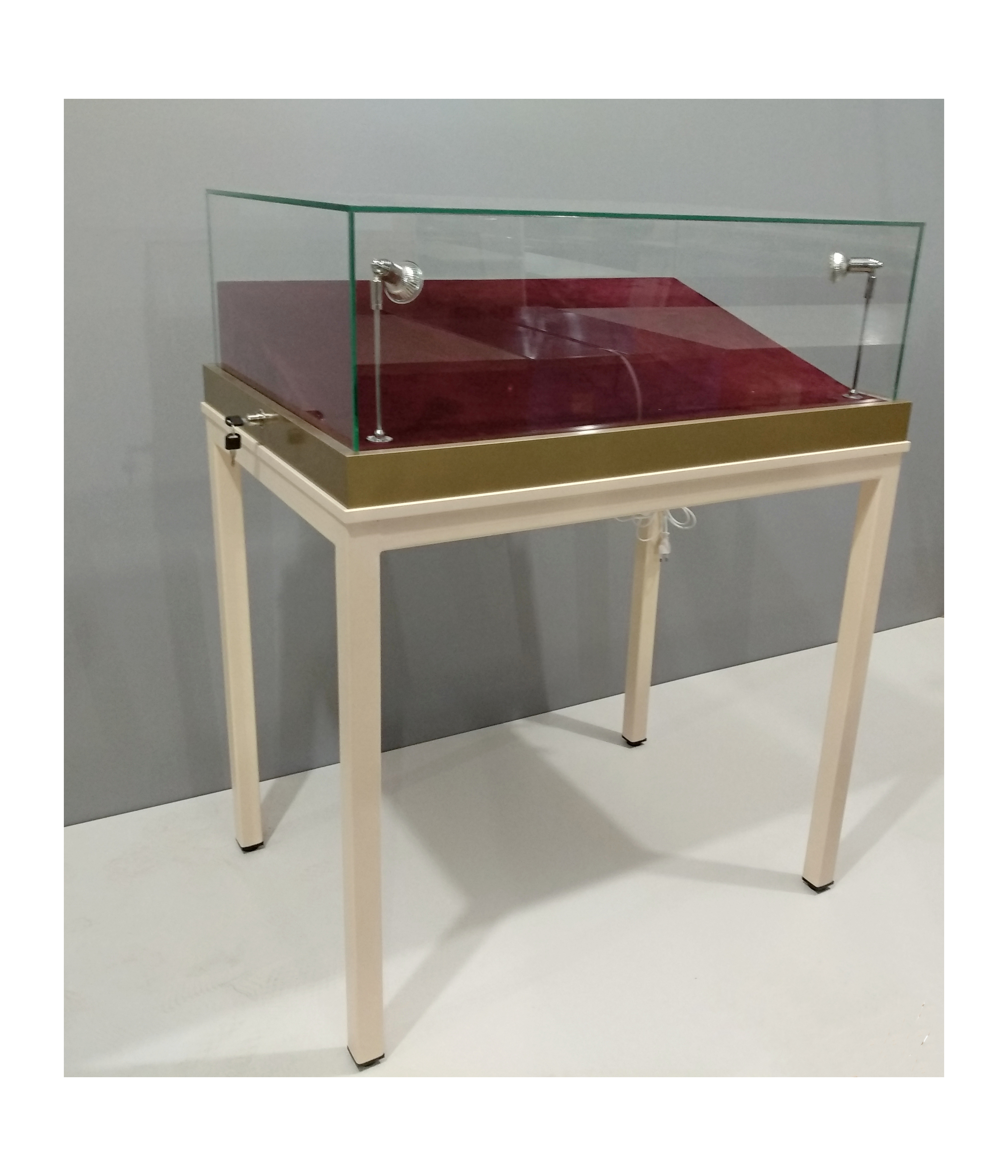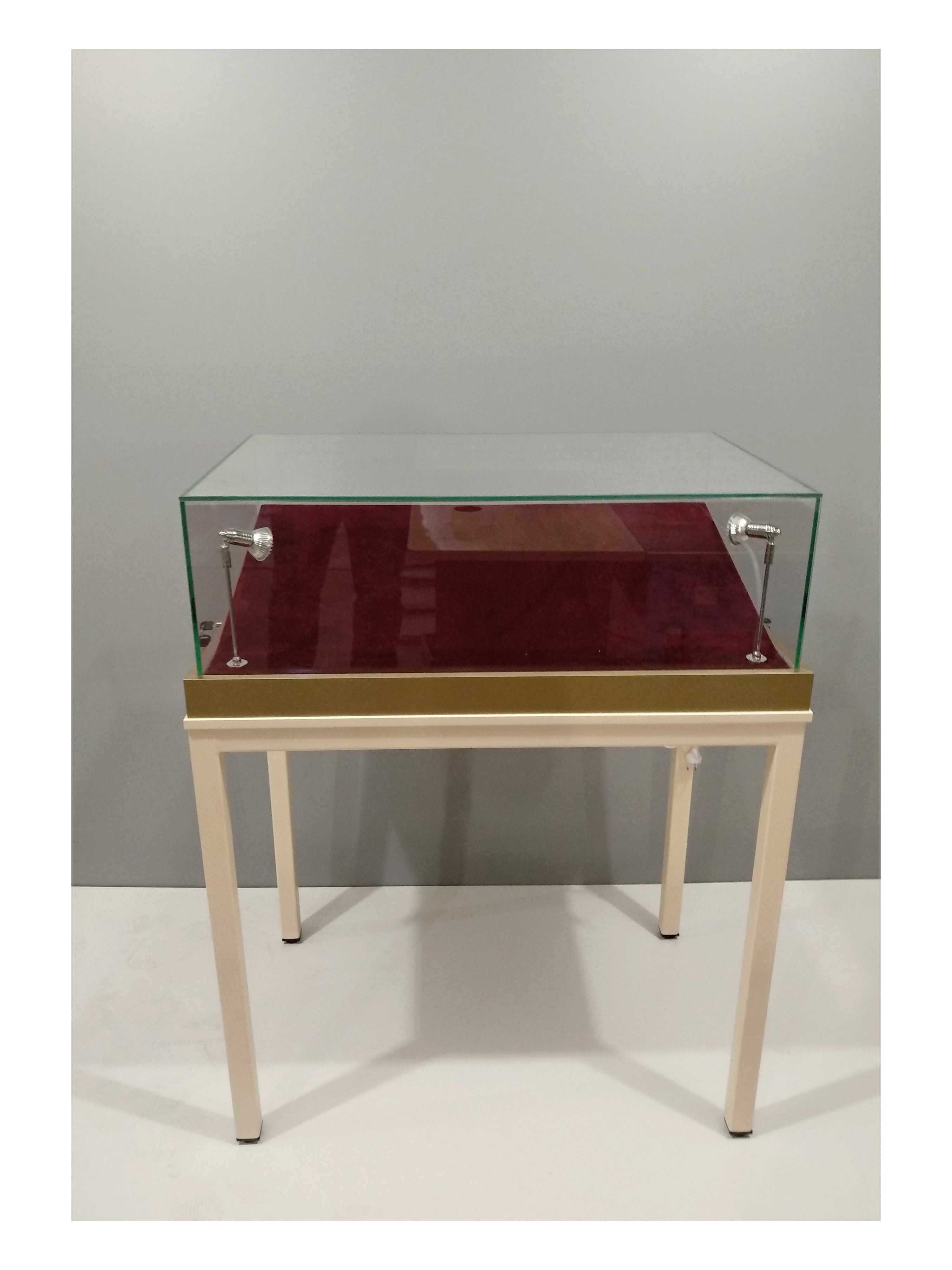 Витрина изготовлена из каркаса металлического профиля, стекла, ЛДСП. Стеклянный колпак - съемный, изготовлен с применением УФ технологии. Запирается 2-мя замками.