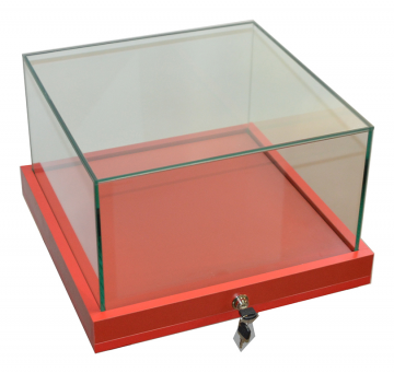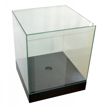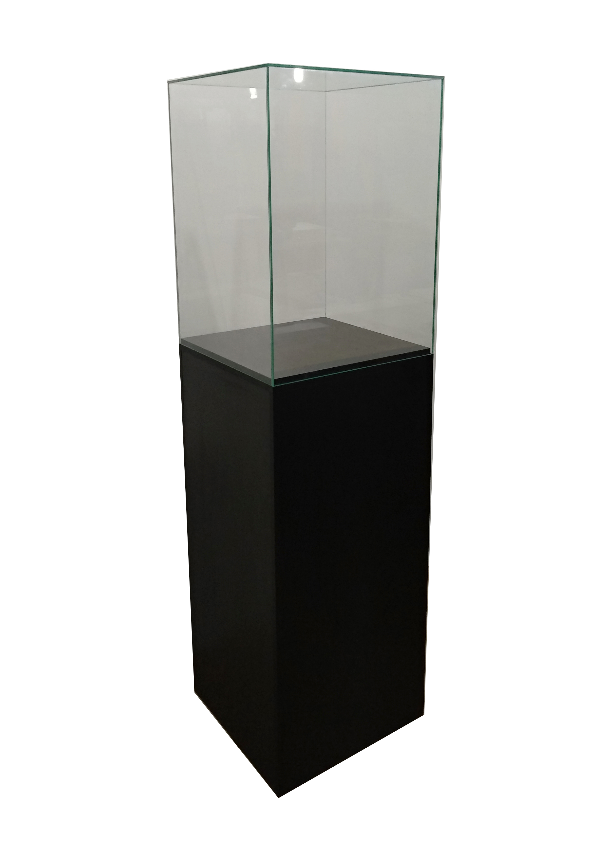 Стеклянный куб -купол 1800х500х500мм ВхГхШ без замка. Изготовление стеклянных кубов на ультрафиолетовой склейке. На фото стеклянный куб 700х500х500мм. Подиум высотой 1100мм. Общая высота 1800мм. Изготовлена витрина из стекла 6мм. и ЛДСП 16мм.