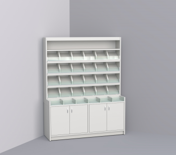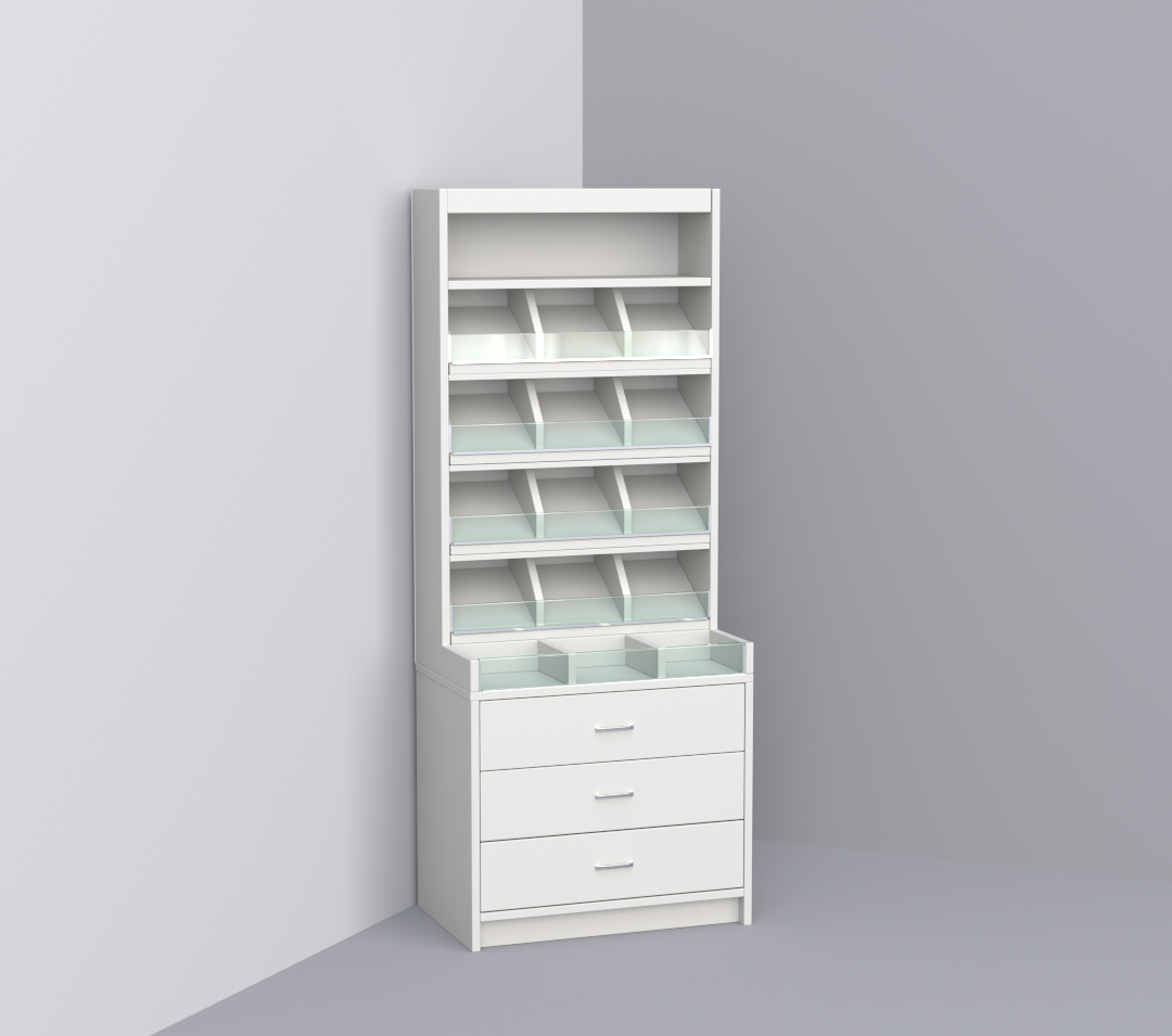 Изготовлен из ЛДСП толщ. 16мм., стекла толщ. 5мм. Надставка высотой 1500мм, 4 наклонных и одна прямая полки. Размер ячейки 300х300х250мм. Размер между полками 300мм. Высота передних ограничителей 90мм. Высота тумбы 800мм, с 3-мя выдвижными ящиками. Цвет на заказ- любой.