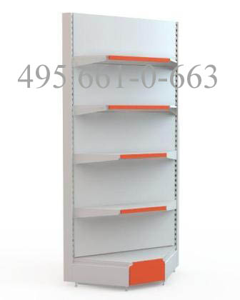 Стеллаж угловой внутренний угол 2225х800х800мм Комплектация: 2полки на 300мм., 2 полки на 400мм, 1 полка основание 500мм. стойка с основанием -1шт. Плинтус фриз и ценникодержатели в комплект не входят.