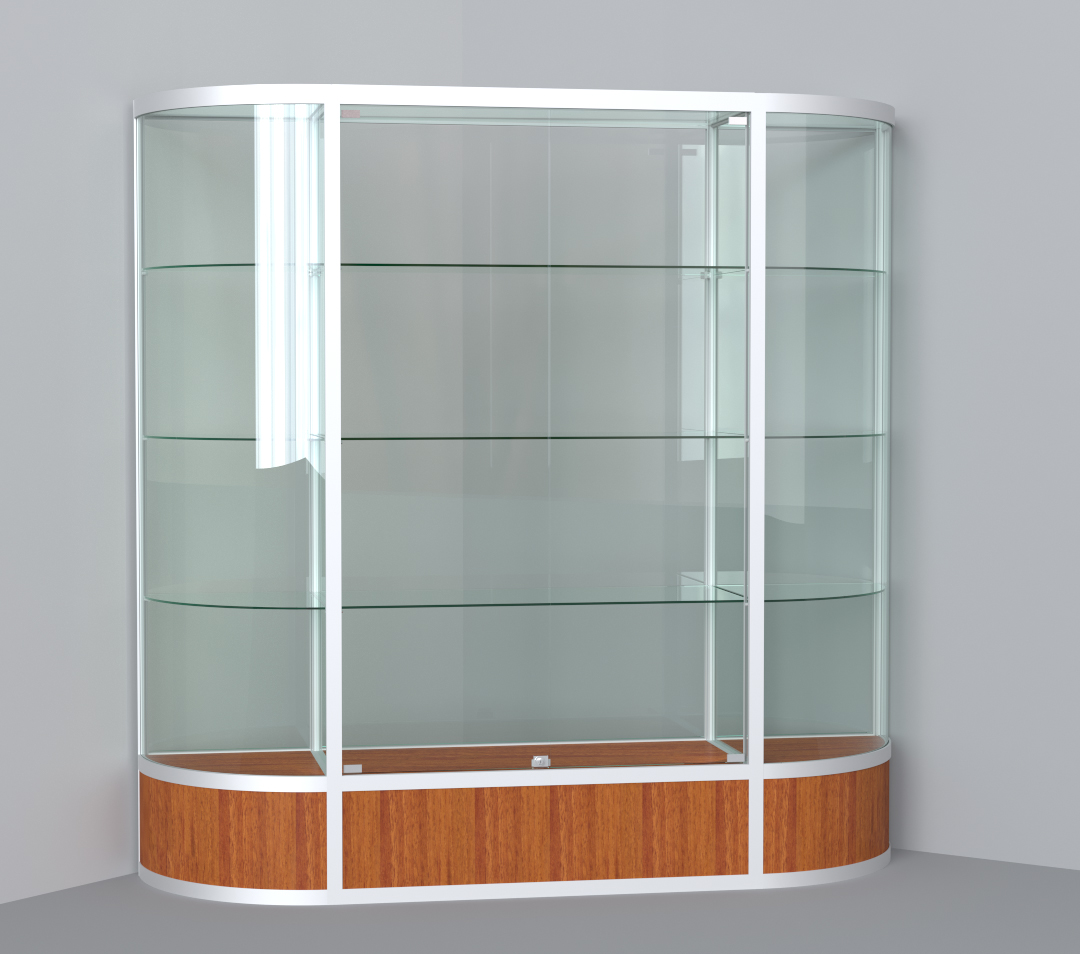 Витрина для кубков высота 2000 мм, глубина 500 мм, длина 2000 мм., с 2-мя радиусными секциями. Подиум 300мм. В комплектации витрины: 3 полки на секцию. Стеклянные распашные двери, замок. Задняя стенка -стекло. Цвет профиля, матовое серебро, цвет наполнителя на выбор из каталога. Витрина для кубков, поставляется в разобранном виде. Для отправки в регионы России, можно заказать жесткую упаковку.