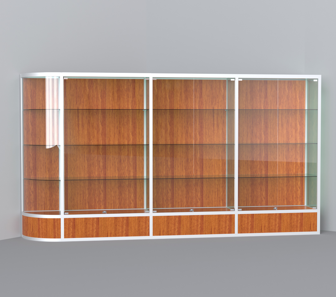 В витрине из профиля в стандартной комплектации: подиум 300мм. 3 стеклянные полки на секцию из стекла 6мм, стеклянные дверцы- стекло 5мм, замок накладной для стекла, также присутствует задняя стенка из лакированого МДФ. Дополнительно можно установить подсветку, как светодиодную, так и галогеновую. Для отправки в регион, можно заказать дополнительную деревянную упаковку- обрешетку.