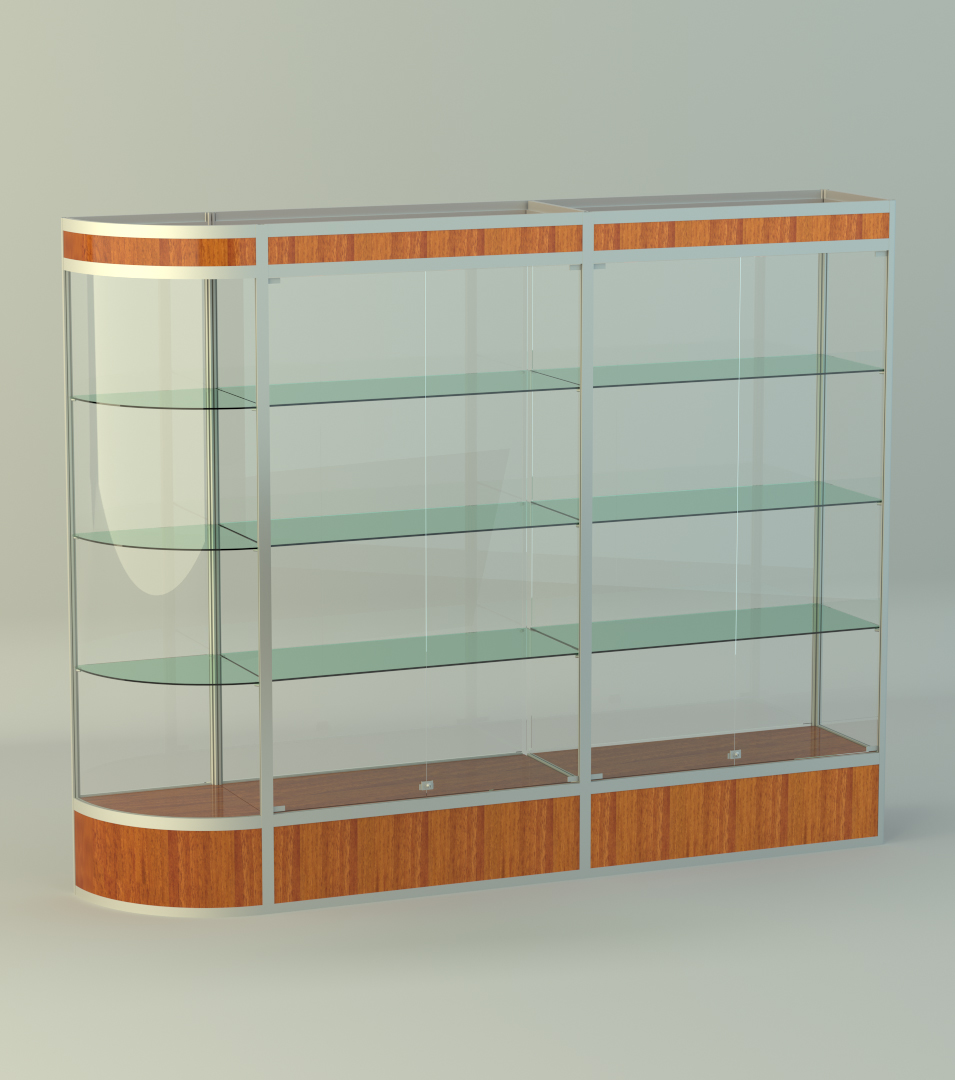 Надежный каркас алюминиевого профиля, в комплекте: 1-радиусная секция с облицовкой из оргстекла, 2-прямые секции, замки для распашных стекол, 3 стеклянные регулируемые полки на секцию. Створки: полированное стекло 5мм. механизм - распашной. Подиум закрытый, высотой 300мм. Задняя стенка -зеркало.