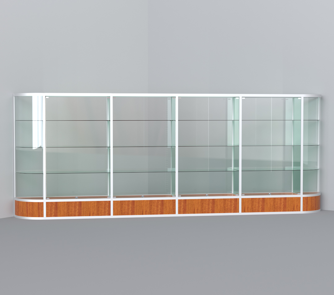 В витрине из профиля в стандартной комплектации: подиум 300мм. 3 стеклянные полки на секцию из стекла 6мм, стеклянные дверцы- стекло 5мм, замок накладной для стекла, также задняя стенка сделана из стекла. Дополнительно можно установить подсветку, как светодиодную, так и галогеновую. Для отправки в регион, можно заказать дополнительную деревянную упаковку- обрешетку.
