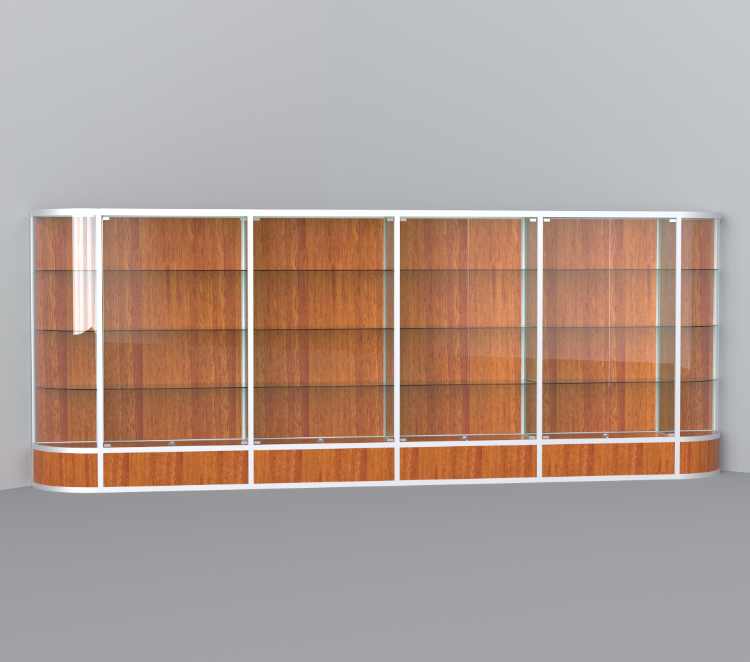 В витрине из профиля в стандартной комплектации: подиум 300мм. 3 стеклянные полки на секцию из стекла 6мм, стеклянные дверцы- стекло 5мм, замок накладной для стекла, также присутствует задняя стенка из лакированого МДФ. Дополнительно можно установить подсветку, как светодиодную, так и галогеновую. Для отправки в регион, можно заказать дополнительную деревянную упаковку- обрешетку.