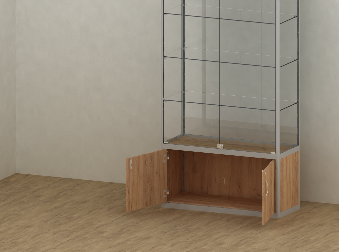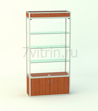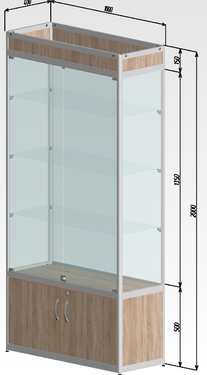 Витрина из каркаса алюминиевого профиля "Малахит СФ500" Размер 2000х400х1000мм. Фриз высотой 150мм. Тумба накопитель высотой 500мм. Стеклянные полки толщиной 6мм в кол-ве 1 шт.Двери в стеклянной части из стекла 5мм., в накопителе ЛДСП 16мм. Механизм распашной. Замок для стекла - накладной, замок для тумбы - врезной. Ручка в накопитель - скоба 96мм. Задняя стенка - МДФ.