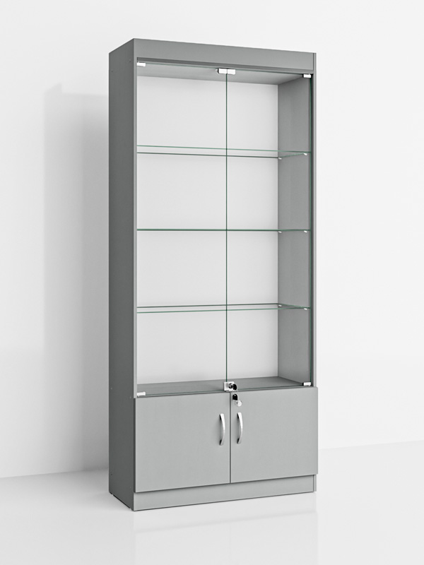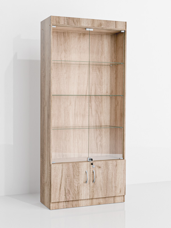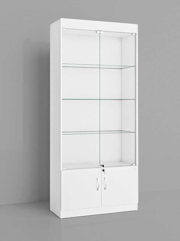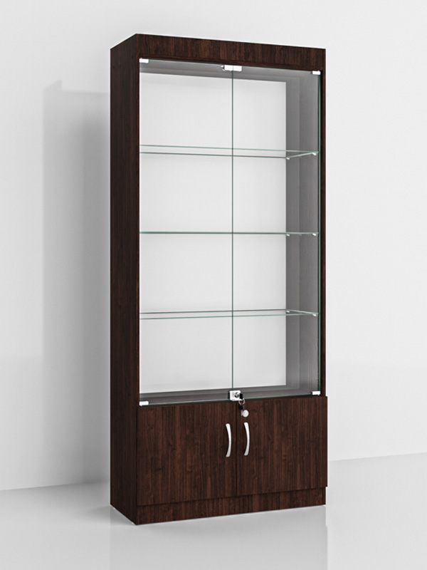 Витрина из дсп серии ЭКВ1-300 с накопителем. Размер 2000х300х900мм. Накопитель высотой 400мм. (за счет невысокого накопителя, появилась возможность выкладывать больше товара в стеклянную часть витрины). В комплектации: 3 стеклянные полки толщиной 5мм. Задняя стенка - МДФ. Дверцы с замком. Накопитель высотой 400мм., с распашными дверцами и замком. Складской декор витрины: