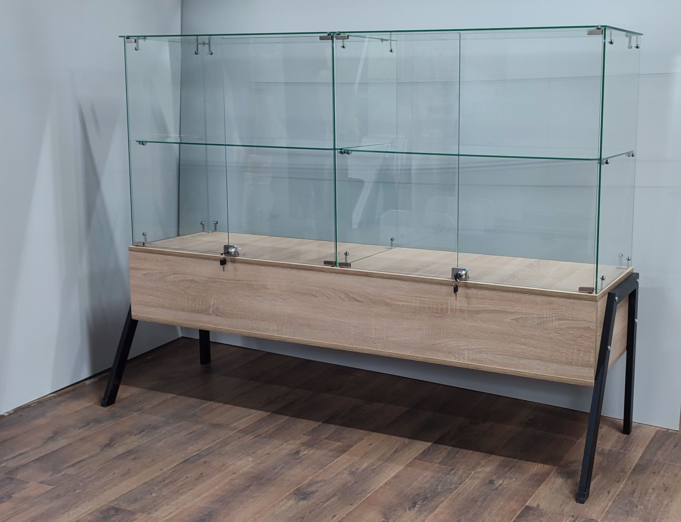 Металлокаркас обеспечивает надежное положение витрины. Эффект парящей витрины. Тумба изготовлена из ЛДСП, обзорная часть изготовлена из стекла 5мм. С полированными краями. В стеклянной части одна полка, нерегулируемая. Двери закрываются на замок повышенной секретности.