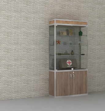 Стеклянная часть витрины высотой 1350мм, с распашными дверками, с 3 -мя полками, которые регулируются по высоте с шагом 1мм.