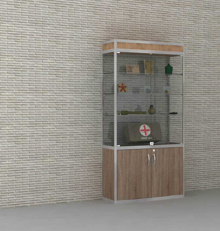 Музейная витрина прямоугольная с полками.Размер витрины 2000х400х1000ммИзготавливается из каркаса алюминиевого профиля, стекла, ЛДСП, ХДФ. В верхней части витрины предусмотрен фриз, для установки в него точечной подсветки. Так же фриз может быть использован для нанесения информационного материала. Стеклянная часть витрины высотой 1350мм, с распашными дверками, с 3 -мя полками, которые регулируются по высоте с шагом 1мм.Накопительная часть витрины, высотой 500мм, с установленными дверями на распашном механизме, запирается на замок.Размер витрины может быть изменен, цвет скорректирован из нашего каталога. - 700901008028 - 700901008028