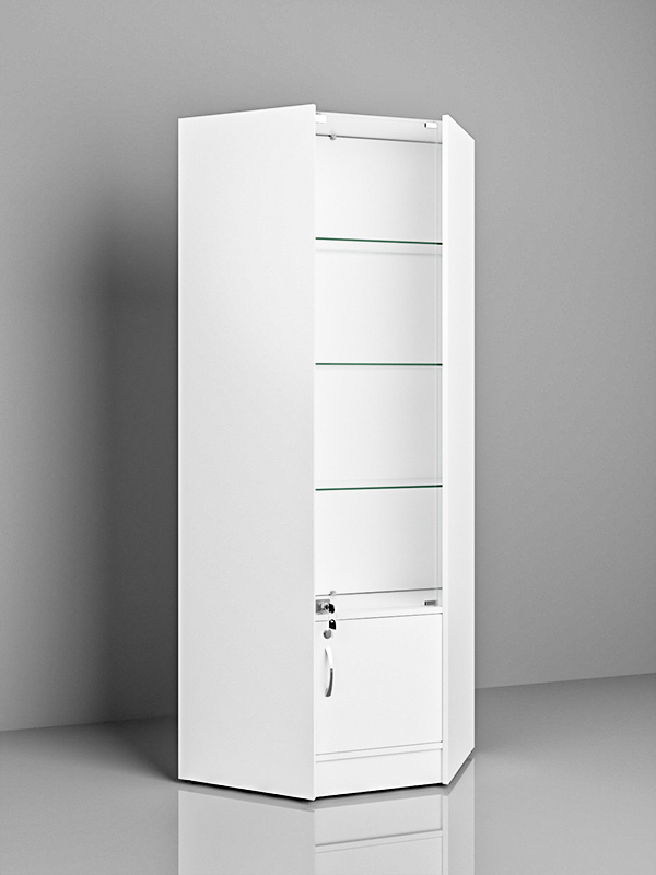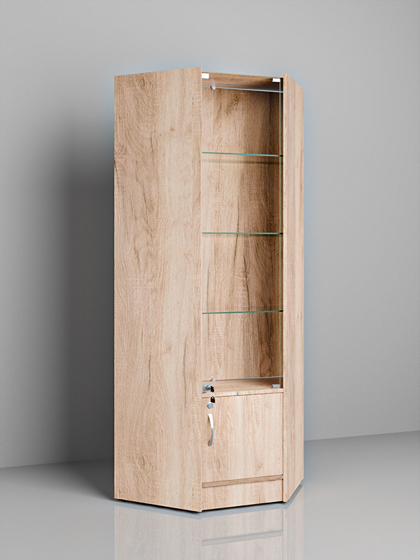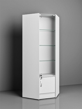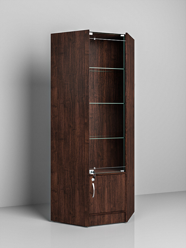 Витрина шкаф для офиса ЭКВУ угловая 2000х700х700мм. Без фриза, с накопителем 400мм. В комплектации 3 стеклянные полки, замок для стекла, замок для дсп. Двери из стекла 5мм. Задняя стенка-стекло. (возможна замена на МДФ, зеркало.