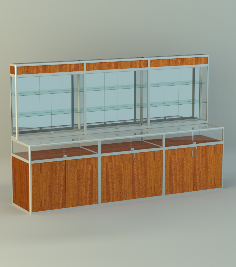 Витрина для музея серии "Комплекс" состоит из 3 модулей. Стол демонстрационный, размером ВхГхШ 900х600х800мм и навесная секция размером 1100х200х800мм. Задняя стенка -стекло прозрачное, стеклянные распашные двери, в подиуме стола- 1 полка ЛДСП 16мм. В комплекте замки.Размер одной секции стол + витрина 2000х600х800мм. Дополнительно можно заказать подсветку, регулируемые опоры, изменить цвет декоративных пенелей и каркаса витрины.