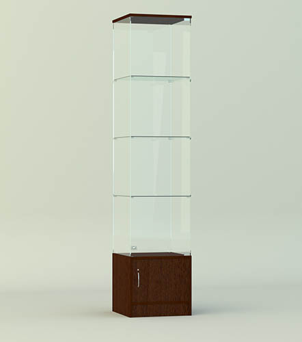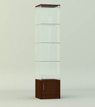 Витрина имеет 3 стеклянные полки, тумбу накопитель, двери распашные, замки.