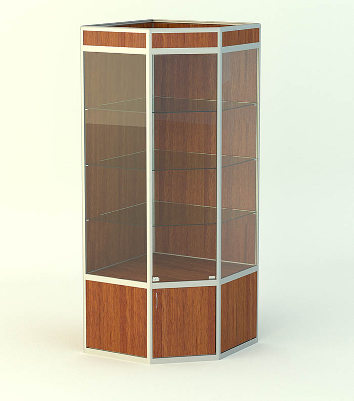Витрина угловая из алюминиевого профиля серии "Агат 5" 2000х700х700мм. Витрина изготавливается из каркаса алюминиевого профиля, стекла, ЛДСП. В верхней части витрины находится фриз высотой 150мм для установки в него точечной подсветки. Также фриз можно использовать как информационное поле, например разместить логотип бренда или др. информацию. Снизу витрины тумба накопитель высотой 500мм с дверкой, замком. Стеклянная часть витрины составляет высоту 1350мм, в ней 3 стеклянные полки, которые регулируются по высоте, стеклянная дверь с распашным механизмом, замок для стекла. Витрина может комплектоваться регулируемыми опорами, возможно изменение цвета и размера.