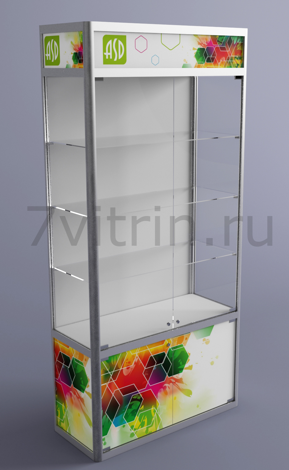 Стоимость указана за каркас витрины из ал. профиля, цвет серебристый матовый, облицовка стекло/ ХДФ белого цвета. На эти витрины можно нанести широкоформатную печать с логотипом и цветом рекламируемой фирмы или товара. В комплектации 3 полки и замки. Дополнительно, можно заказать подсветку.Цена указана розничная, партнерам и оптовикам скидки до 20%.